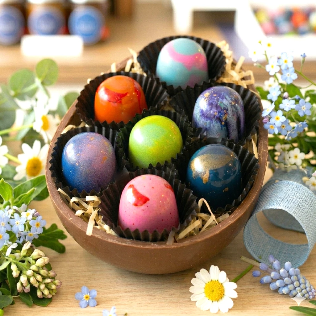 Indulge in our delightful half-shell Easter eggs, each filled with handcrafted, colourful chocolate bonbons.